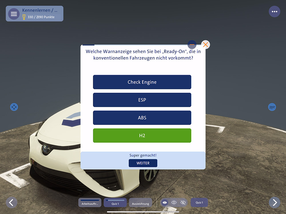 The KFZ Hydrogen app is specifically aimed at participants in advanced vocational training in automotive mechatronics at the Education Academy of the Stuttgart Region Chamber of Skilled Crafts. It was developed to enable innovative and future-oriented further education that deals intensively with alternative drive technologies - with a particular focus on the hydrogen system of the Toyota Mirai.