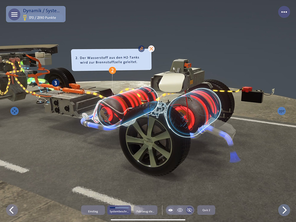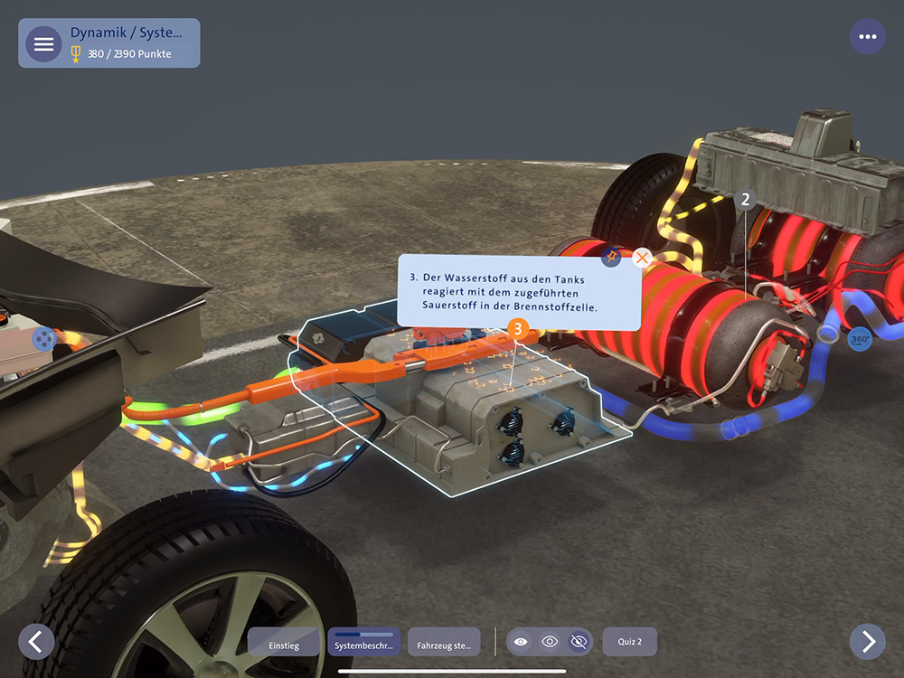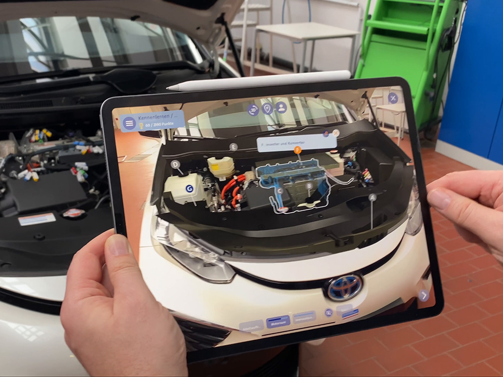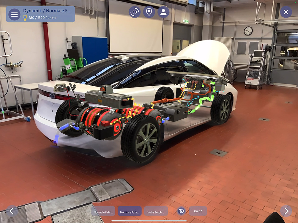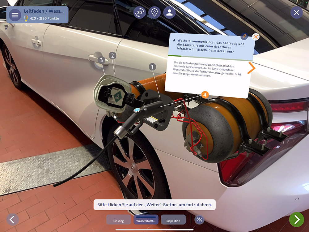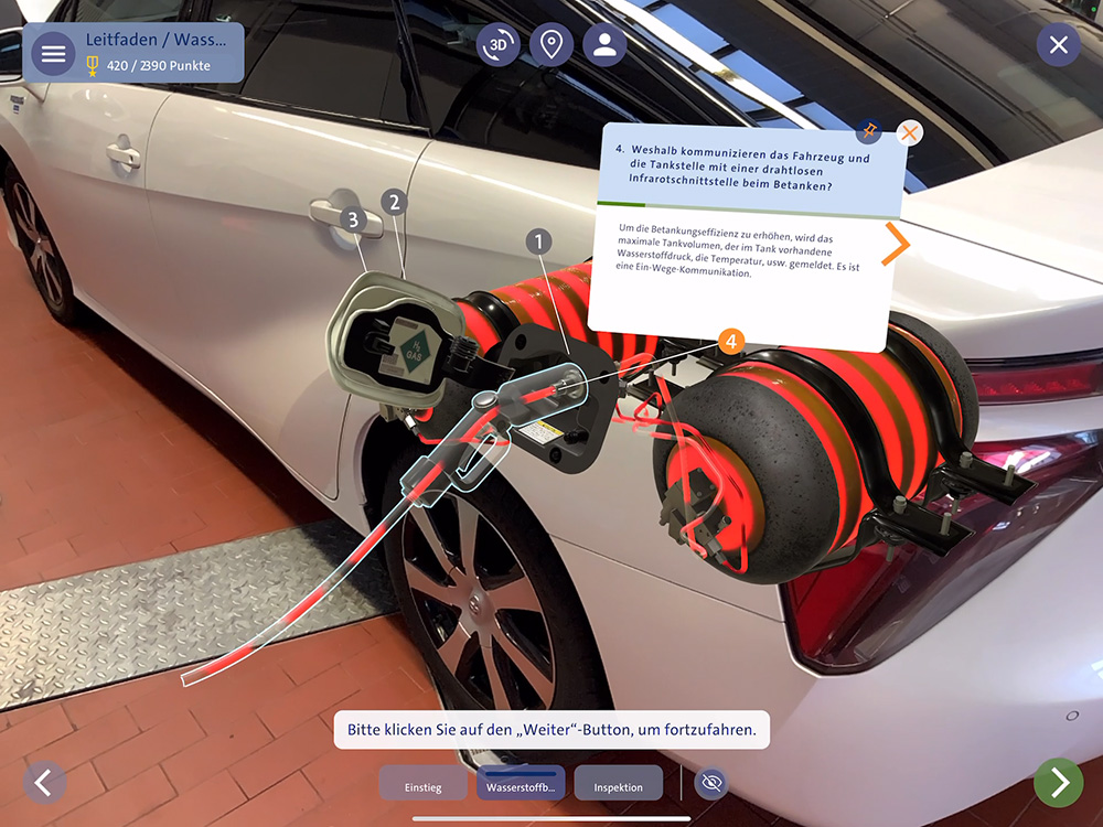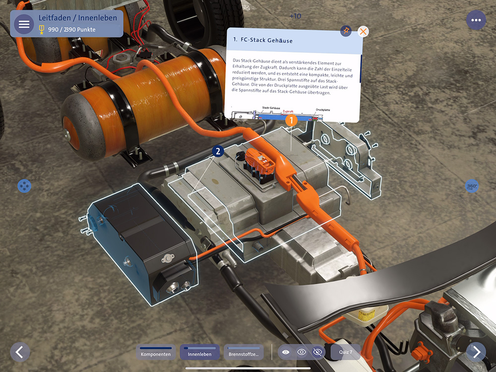KFZ Hydrogen is an augmented reality app, part of a training series specifically designed for vocational education in the skilled trades. The aim of this app is to enrich vocational training with fascinating, interactive learning content and, at the same time, to promote the transition from traditional classroom instruction to modern self-study phases.